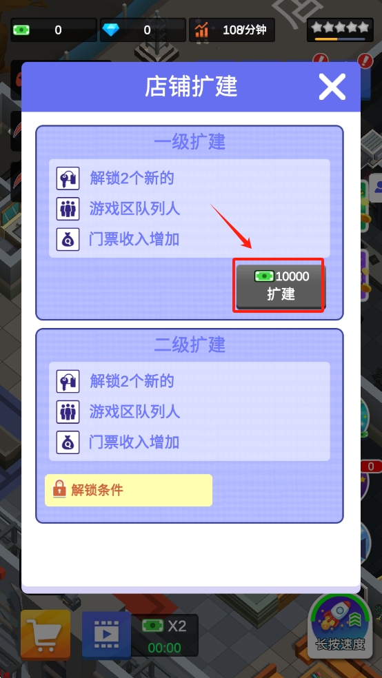 3、在店铺扩建界面,选择一级扩建,支付10000费用,解锁新游戏区队列人。