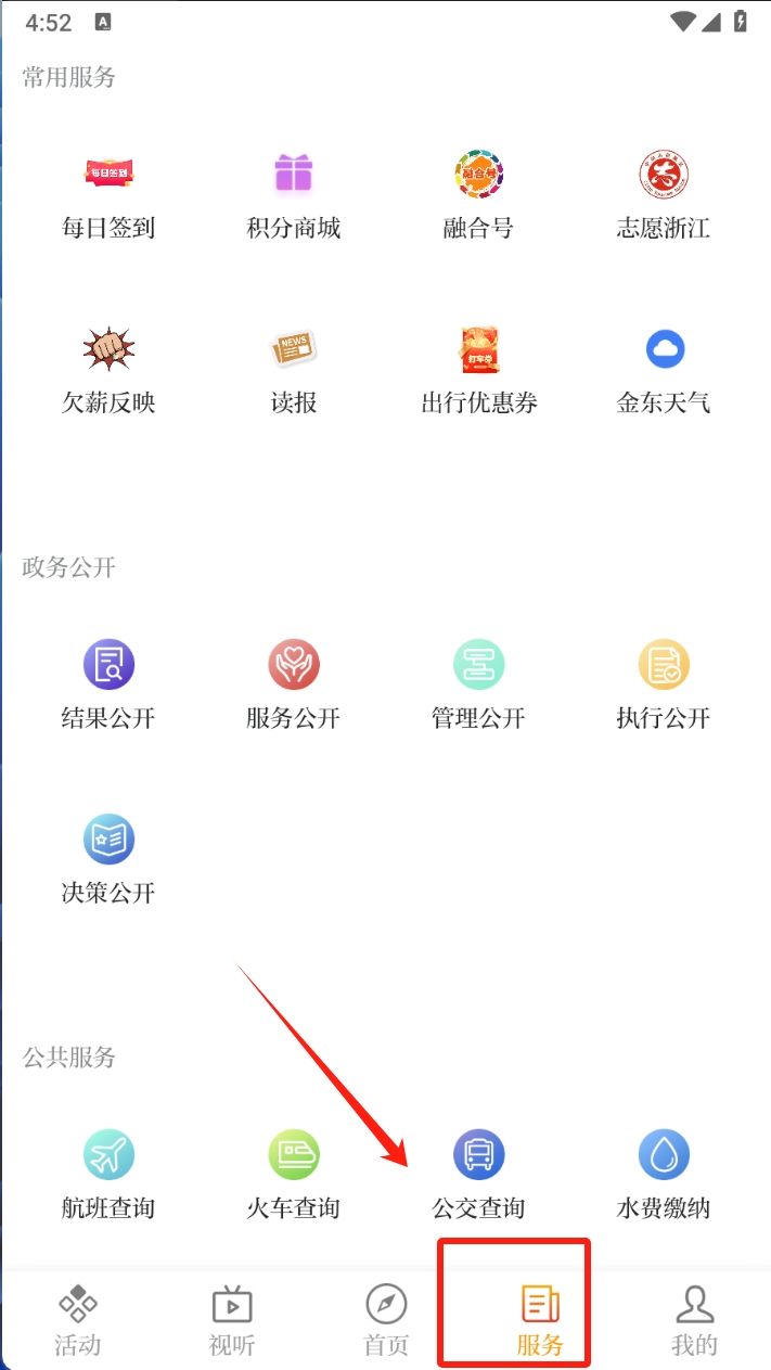 3、点击底部导航栏的“服务”图标,进入服务页面,选择需要的公共服务功能。