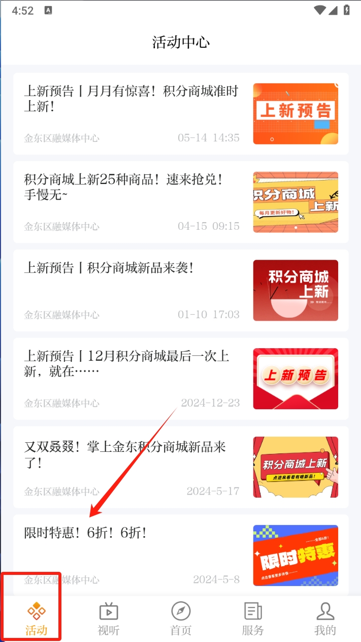 1、打开金东融媒软件,点击首页导航栏的“活动”图标,进入活动中心查看最新活动。