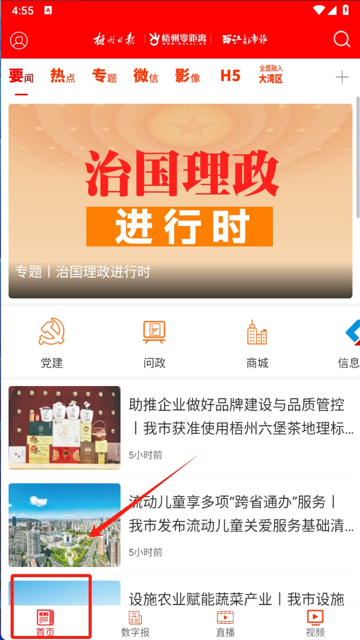 1、打开梧州零距离软件,点击底部导航栏的“首页”图标,进入首页浏览新闻。