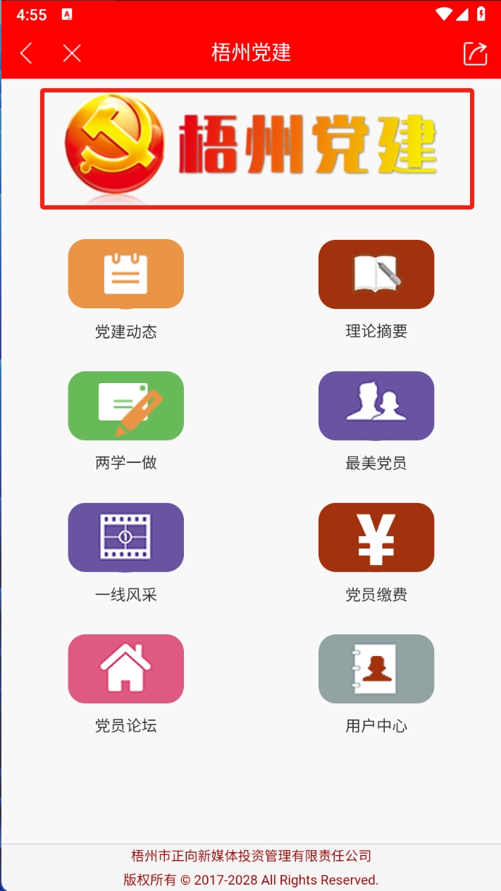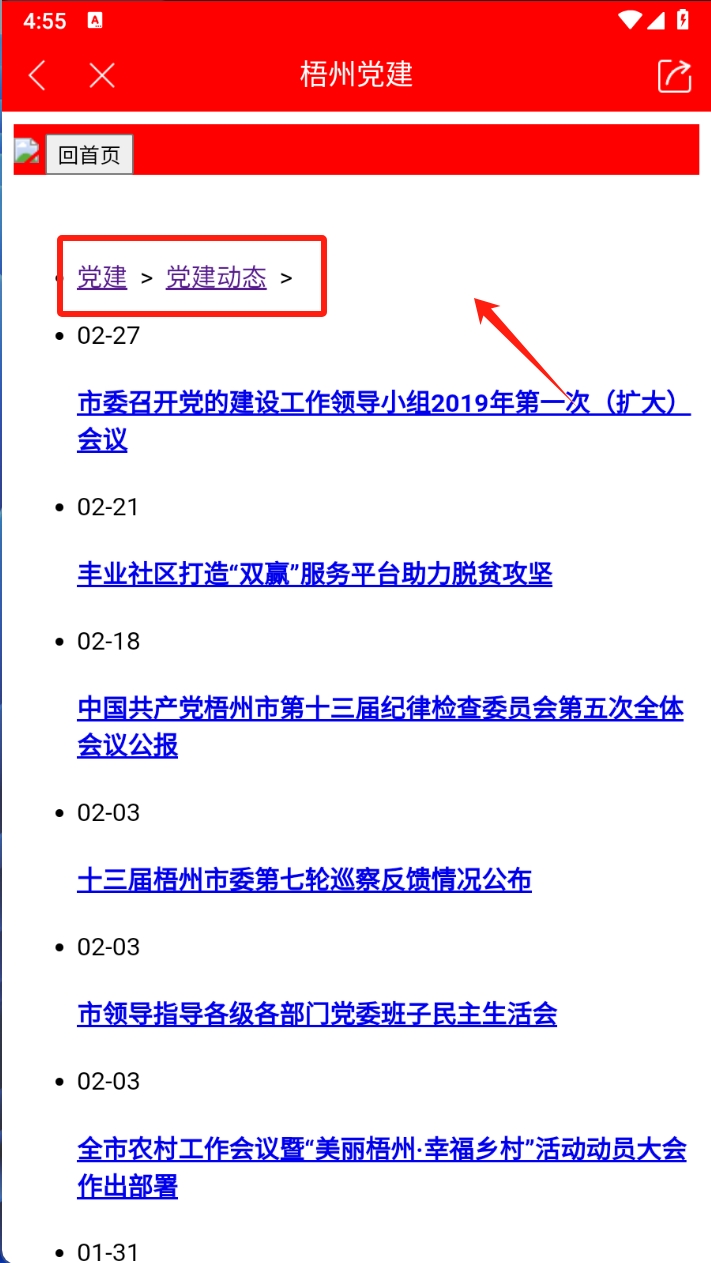 2、点击首页顶部的“梧州党建”图标,进入梧州党建页面查看相关信息。