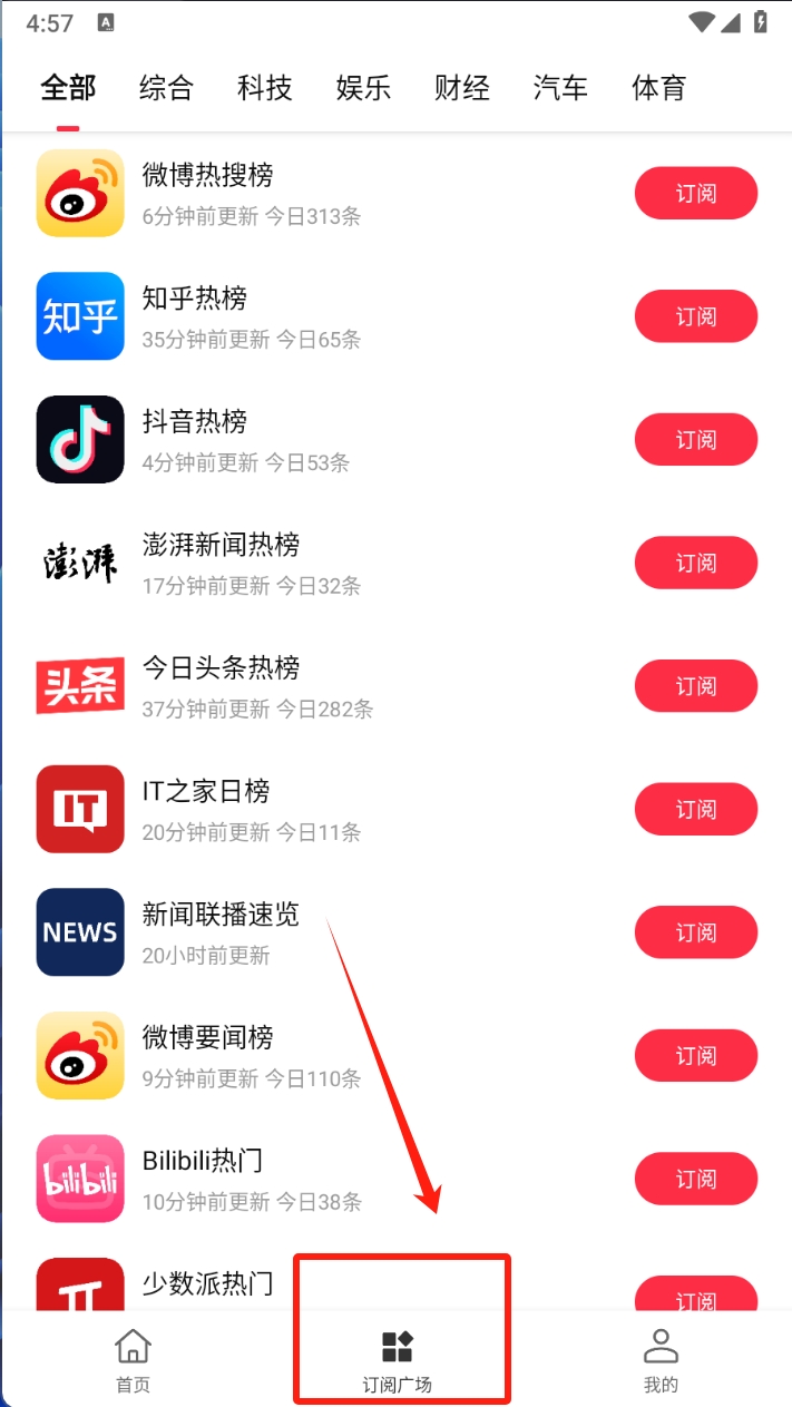 2、点击底部导航栏的“订阅广场”图标,进入订阅广场管理你的新闻订阅。