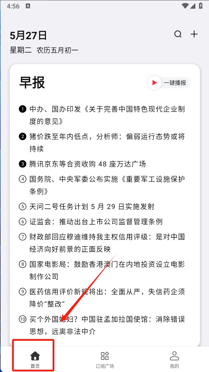 1、打开新闻订阅软件,点击底部导航栏的“首页”图标,查看每日早报新闻。