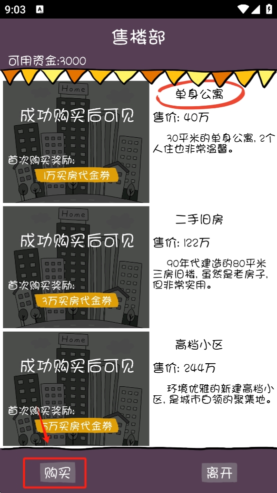 3、点击售楼部购买按钮,合理运用有限的可用资金,精心选购心仪的房产。