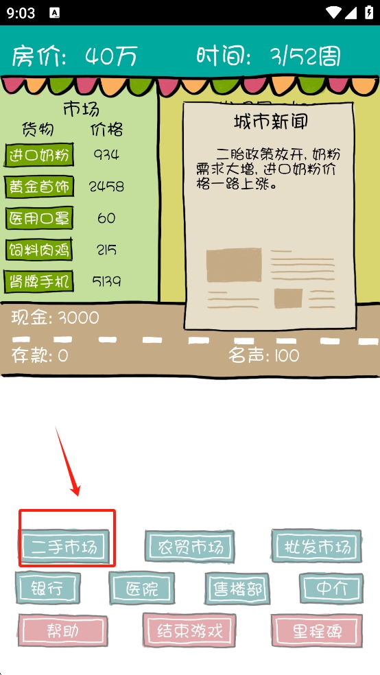1、基础操作:开局3000元,每天可买卖不同商品,如食品、电子产品等,价格随市场浮动,找准时机套利。