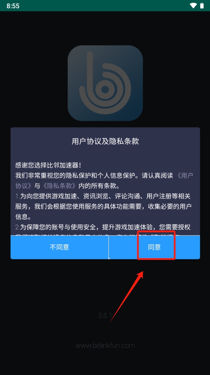 1、同意用户协议及隐私条款。点击“同意”按钮以继续操作。