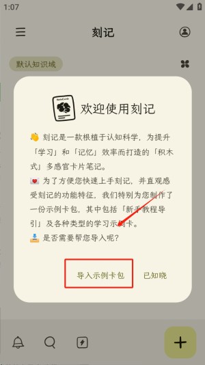 2、接着,欢迎界面会提示您导入示例卡包,点击“导入示例卡包”按钮以获取示例内容。