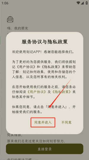 1、首先,阅读并同意服务协议与隐私政策,点击“同意并进入”按钮以继续。