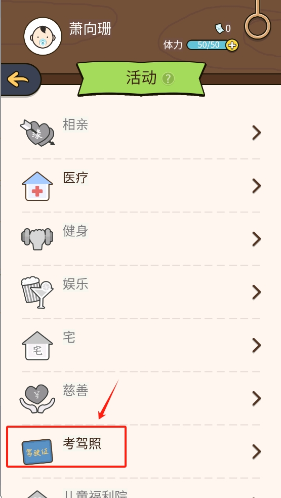2、在活动列表中,精准地点击“考驾照”选项,开启驾驶生涯第一步。