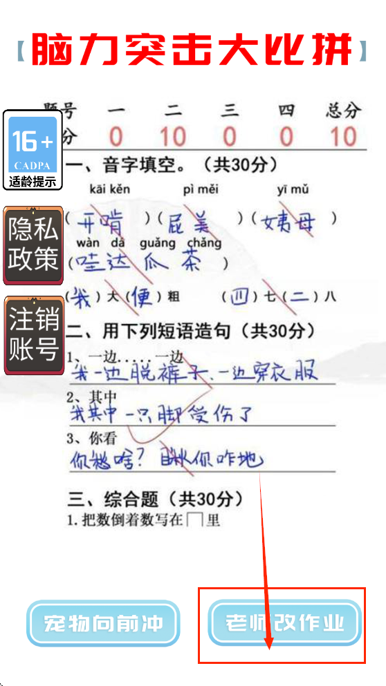 安卓脑力突击大比拼让你体验当老师的乐趣,主要任务就是批改学生试卷。仔细检查每道题的答案,找出错别字和错误解答,给出公平分数。前期作业比较简单,后面题目越来越难,错处也藏得更深。游戏操作容易上手,但想拿满分需要火眼金睛。卡通风格的试卷和批改过程充满趣味,看到学生进步特别有成就感。适合喜欢轻松益智游戏的玩家,既能放松心情又能锻炼观察力,玩着玩着就上瘾了。