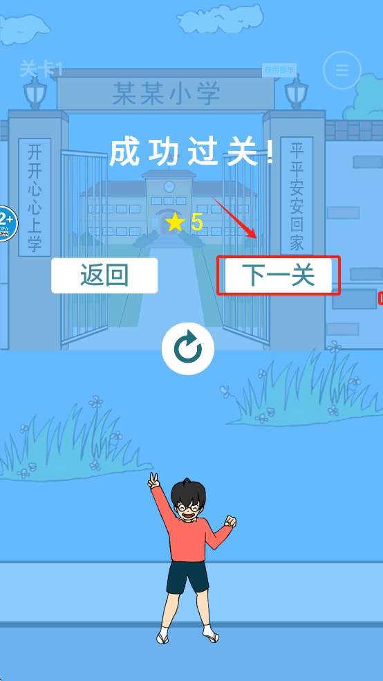 3、进入学校后,点击屏幕上的“下一关”按钮,继续下一关卡。