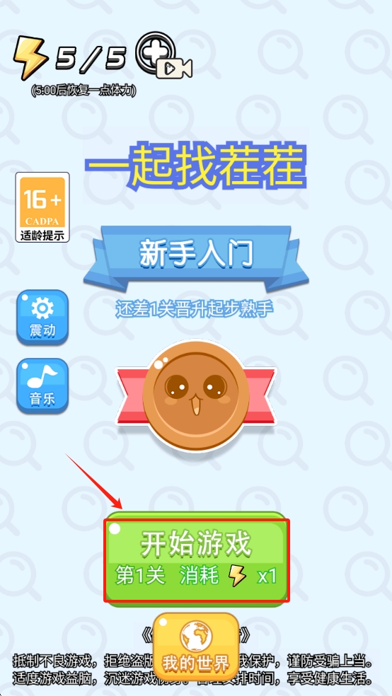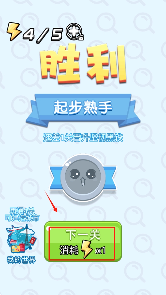 1、点击游戏首页中间的“开始游戏”按钮,消耗一点体力进入第一关。
