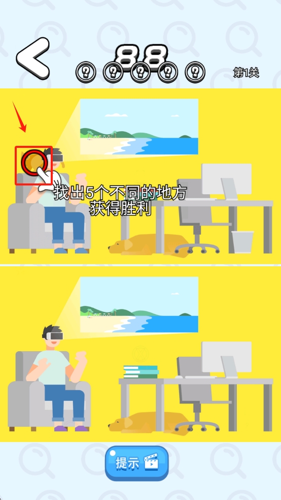 2、进入后仔细对比两张图片,点击找出不同的地方,找出五个即可通关。