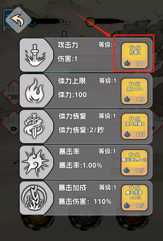 1、点击“升1级”按钮,消耗相应资源提升角色属性,增强战斗能力。
