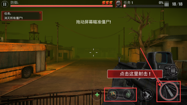 3、拖动屏幕瞄准僵尸后,点击子弹按键进行射击,点击旁边的框选按键可以使用技能。