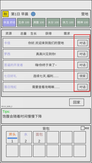 2、进入营地后,可以选择和不同角色进行对话或领取物品。