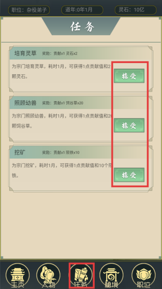 2、点击下方【任务】,再点击【接受】,完成后可以领取对应奖励。