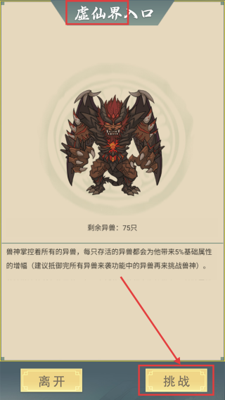 3、进入【虚仙界】,再点击【挑战】即可挑战兽神。
