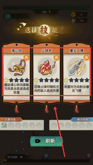 3、深度策略博弈:每局技能选择需权衡短期战力与长期成长,如优先选取经验加成BUFF加速升级,或直接获取高伤技能应对危机。