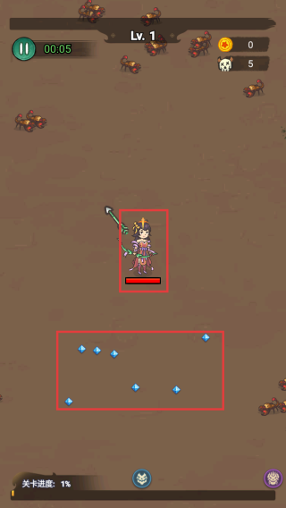 2、点击屏幕控制角色移动,敌人进入一定范围内,角色自动攻击。