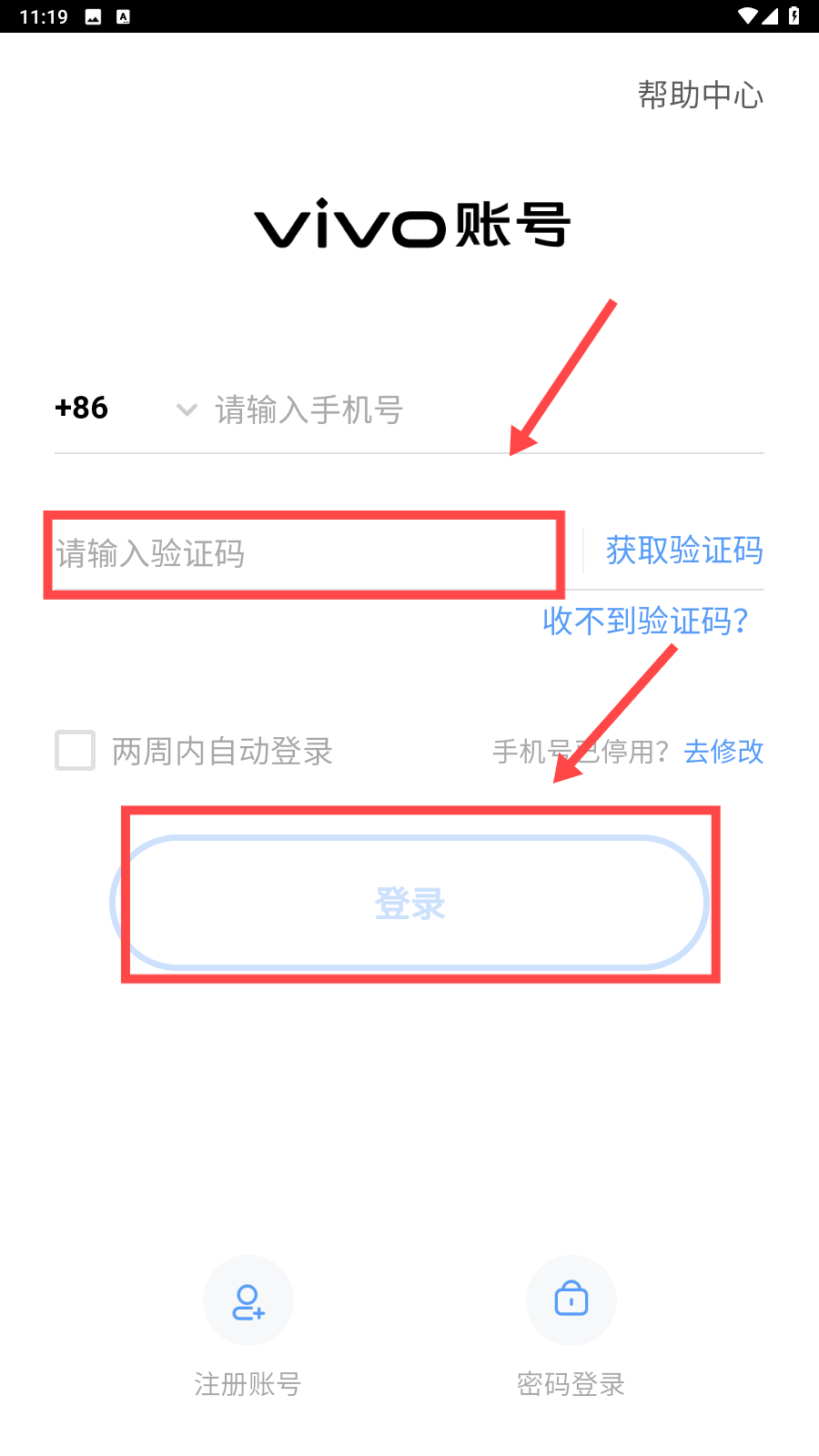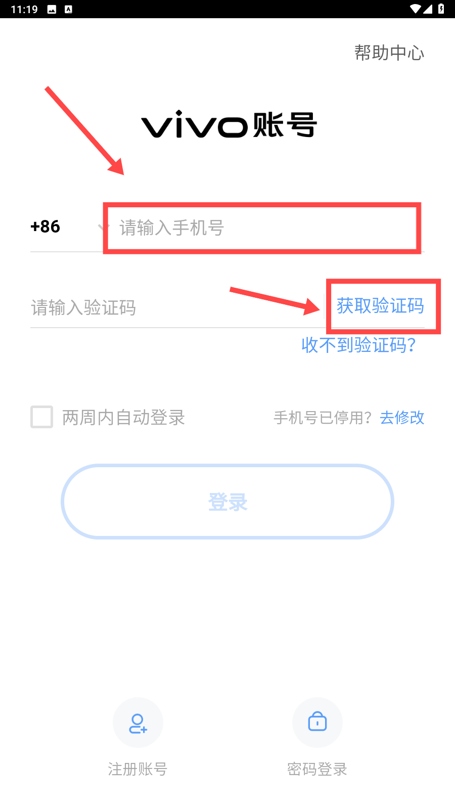 2、输入手机号后,点击【获取验证码】。