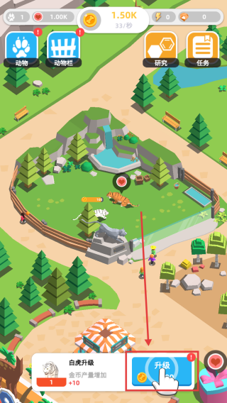 2、升级提升收益:通过各种升级操作,大幅提高获取金币的效率,为动物园的扩建发展提供资金支持。