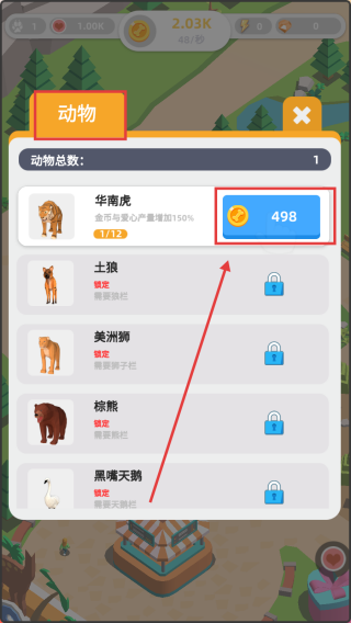 3、点进【动物】界面,购买新的动物,获得对应的增益。