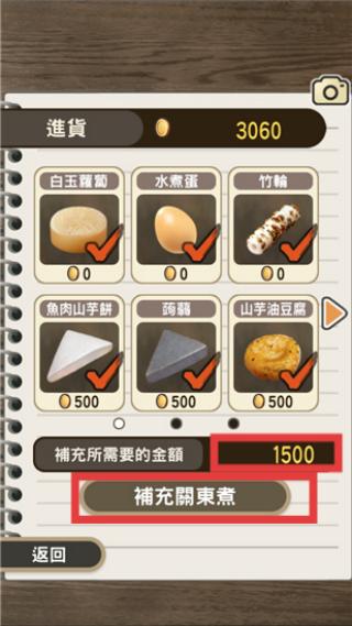 3、每隔一段时间就要进货,选择好要补充的食材后,下方显示进货金额,最后点击【补充关东煮】即可。
