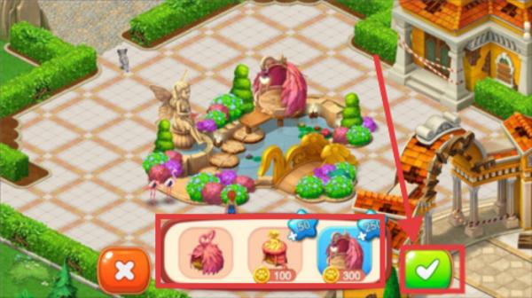 3、完成三消关卡即可获得货币,点击下方建筑物,拖动建筑物到空地上,再点击绿色按键,即可成功放置。