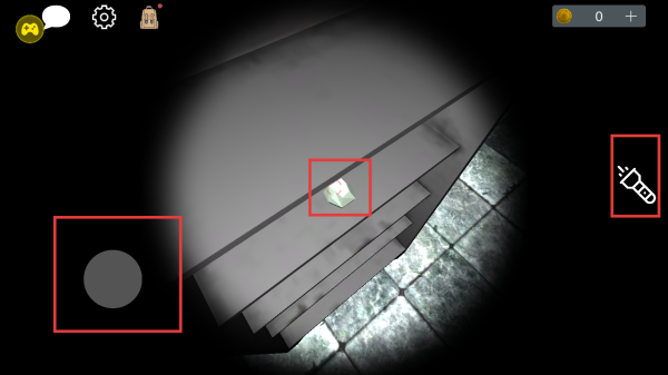 3、进入游戏界面后,划动摇杆控制角色移动,点击手电筒可以切换开关状态,瞄准物品后,鼠标点击即可拾取物品。