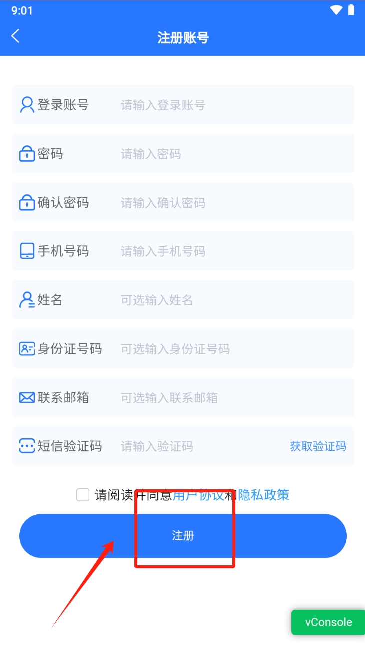 2、其次,填写注册信息。在注册账号页面,输入登录账号、密码、确认密码、手机号码等信息,并获取短信验证码进行验证。