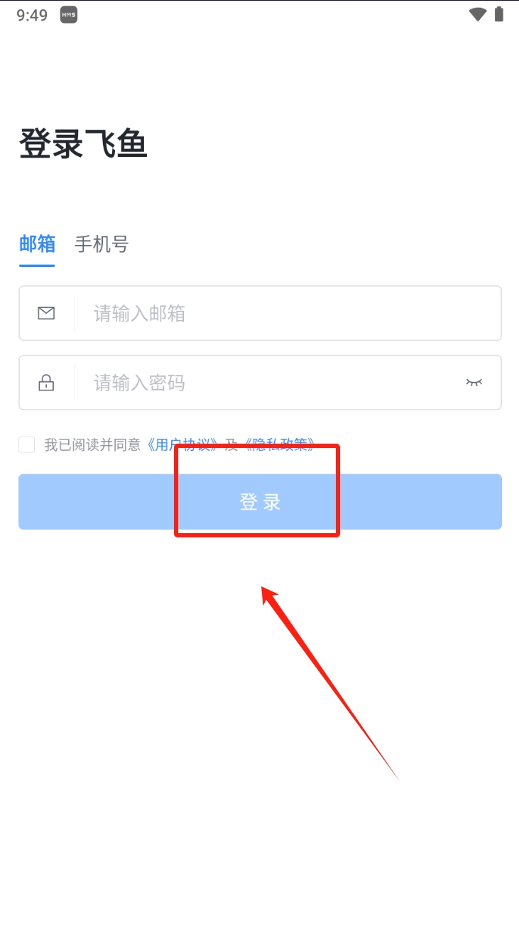 3、最后,登录飞鱼账号。在登录页面,输入您的邮箱和密码,勾选同意用户协议和隐私政策,然后点击“登录”按钮进入飞鱼软件。