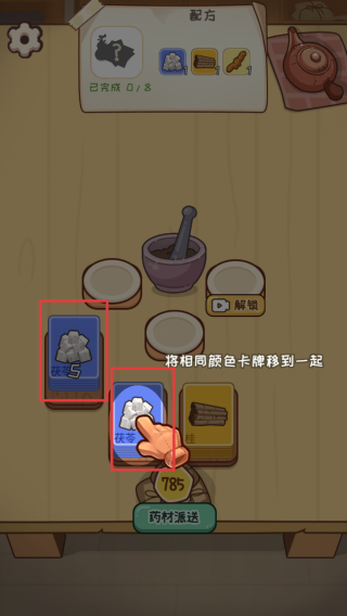 1、消除收集玩法:通过消除游戏收集药材卡牌,为制作中药配方积累必要材料,提升药材储备量。