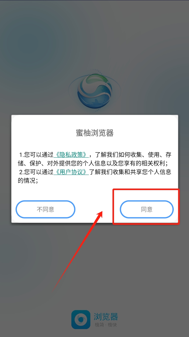 1、首先,同意隐私政策。在首次打开蜜柚浏览器时,阅读隐私政策说明,点击“同意”按钮以接受条款,继续使用浏览器。