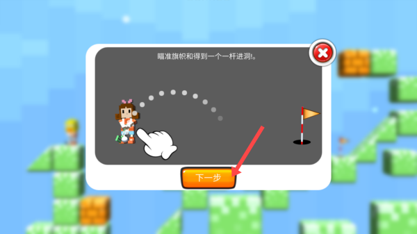 2、出现提示框时点击【下一步】,了解瞄准旗帜实现一杆进洞的操作指引。