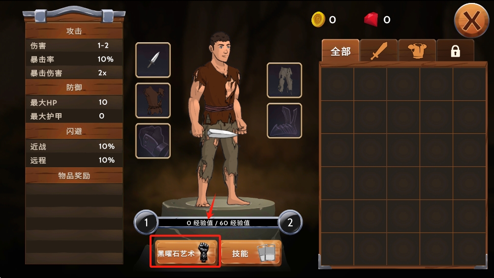 2、进入角色界面查看角色属性,点击相应按钮查看物品奖励和技能信息。
