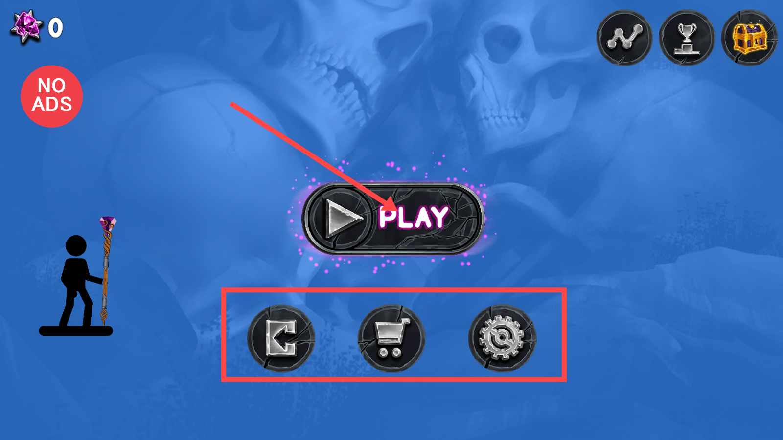 1、进入游戏主界面后,点击【PLAY】按钮开始游戏,下方图标分别为返回、商店和设置,可根据需求操作。