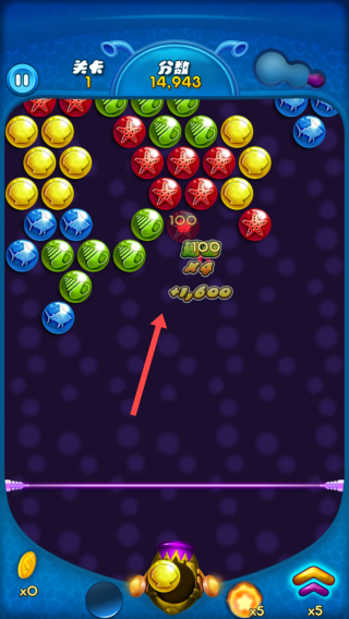3、通过发射泡泡,使相同颜色的泡泡相连消除,获取分数,如箭头所指处的消除得分。