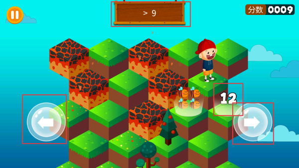 2、根据上方出示的题目,按左右按键控制阳阳跳跃方向,并需要跳至正确答案上。