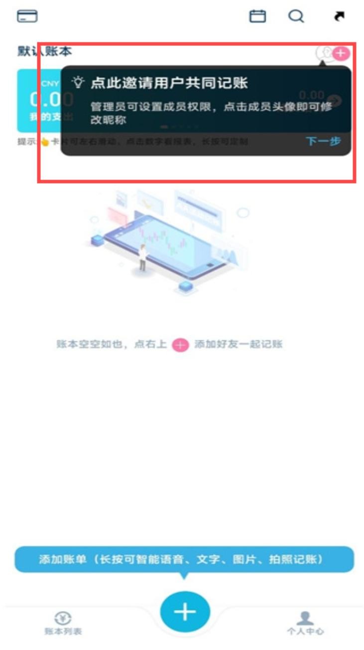 2、在默认账本页面,点击提示框中的“下一步”以邀请用户共同记账。
