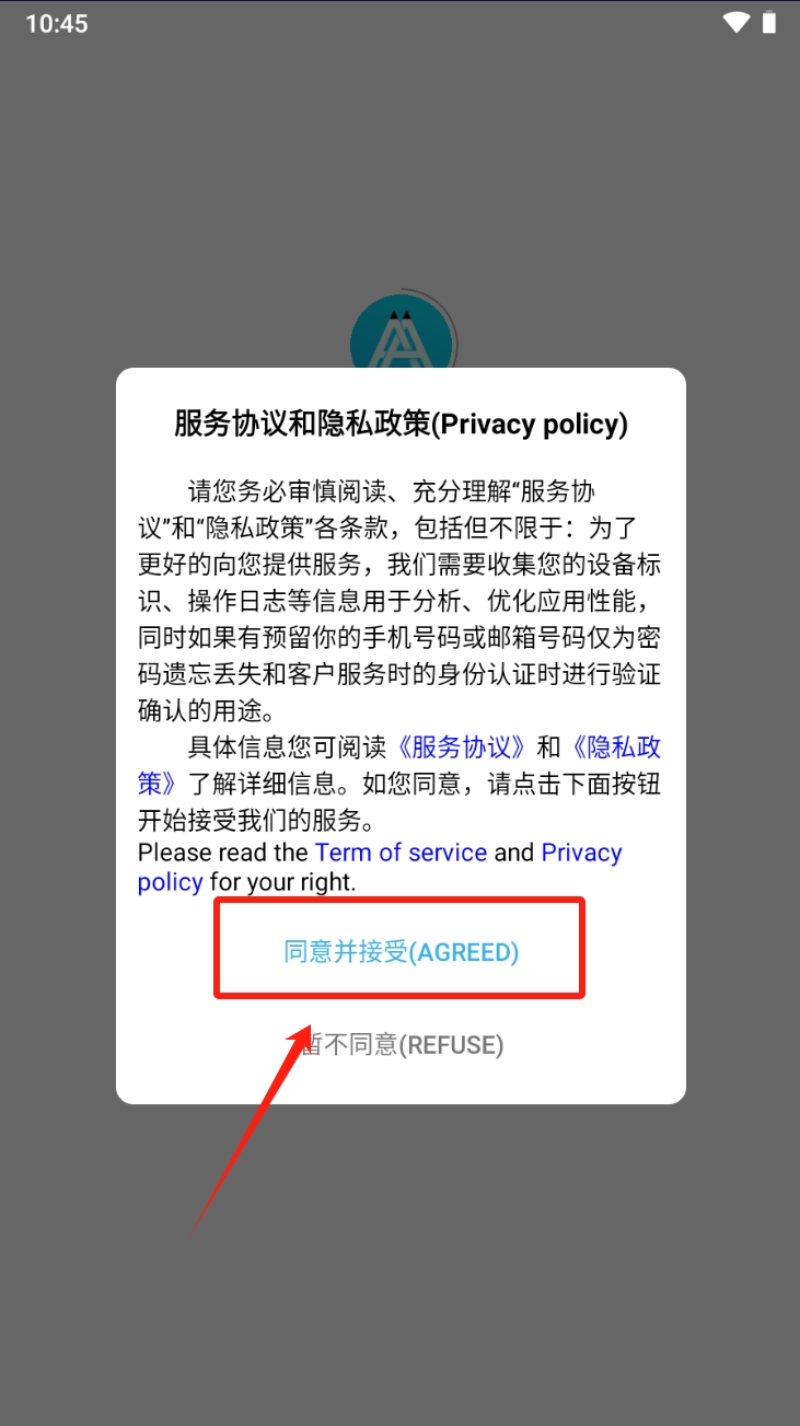 1、仔细阅读服务协议和隐私政策,点击“同意并接受”以继续。