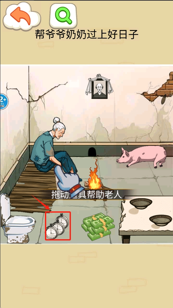 3、在任务界面,拖动道具到指定位置,帮助老人完成任务。