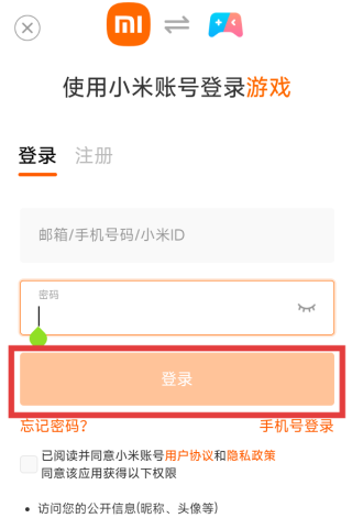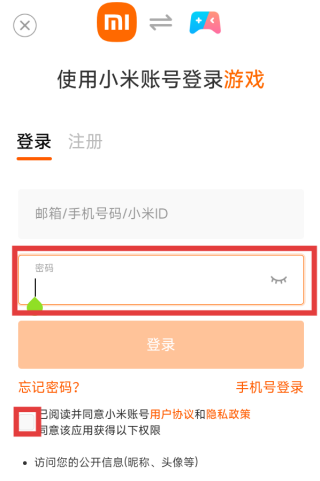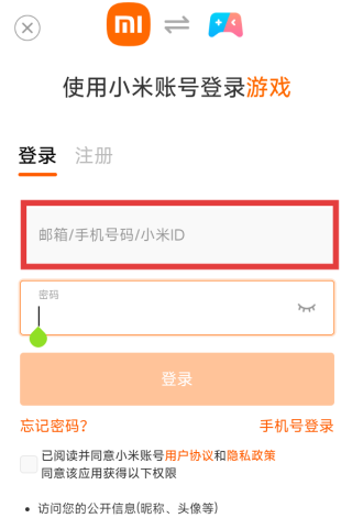 1、打开登录界面,输入【邮箱】,或【手机号码】、【小米ID】。