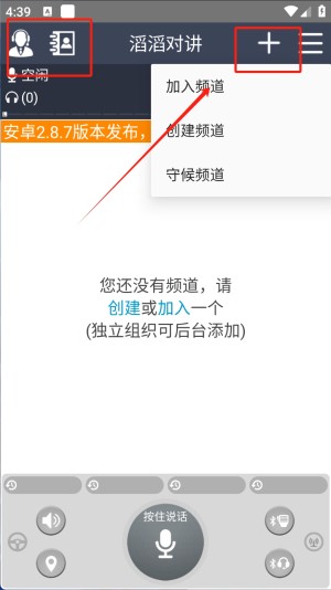 4 、点击右上角的“+”按钮,选择“加入频道”来加入一个已有的频道,或者选择“创建频道”来创建一个新的频道。
