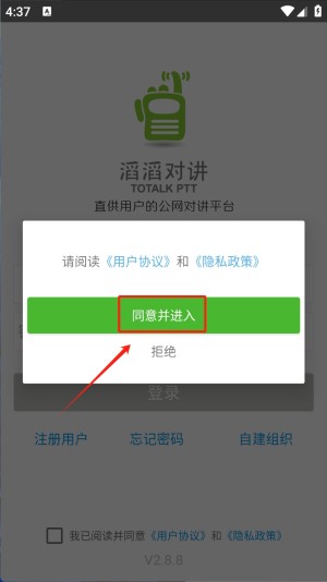 2、首次打开滔滔对讲应用时,阅读并同意《用户协议》和《隐私政策》,然后点击“同意并进入”按钮。