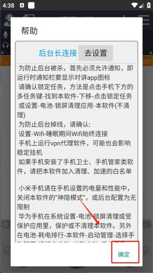 1、查看帮助信息,了解后台长连接的设置方法。点击“确定”按钮以关闭帮助信息窗口。