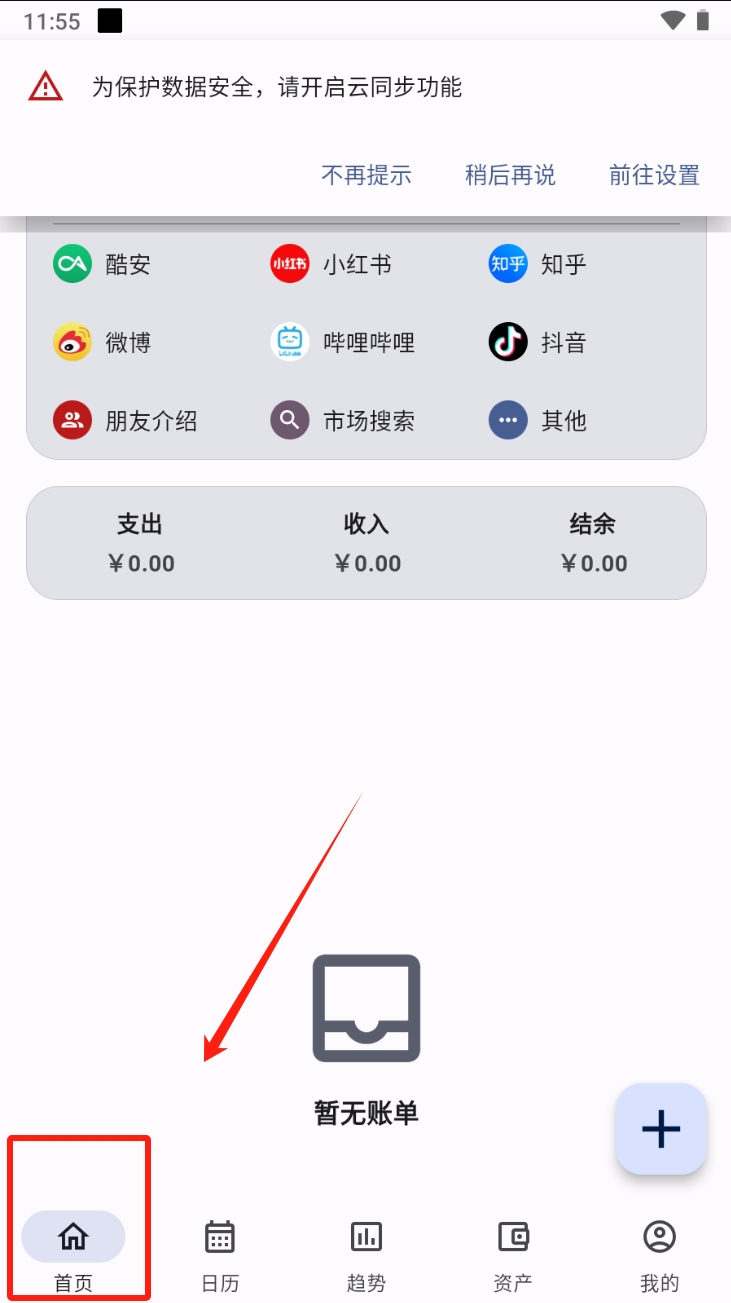 1、点击“首页”按钮,查看支出、收入和结余的总览信息。