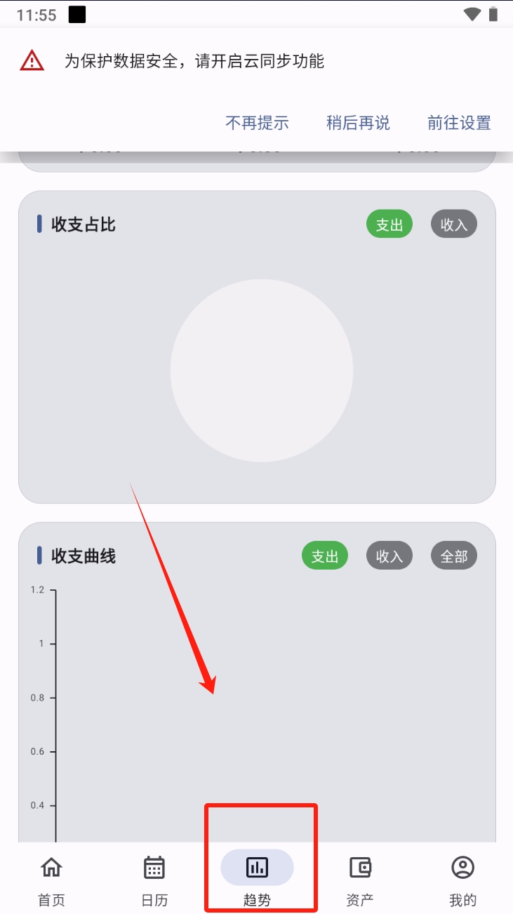 3、点击“趋势”按钮,查看收支趋势图和占比分析。