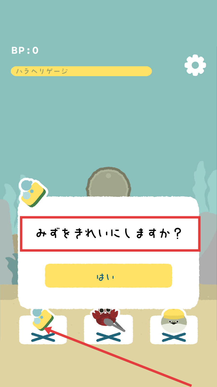 3、看到【みずをきれいにしますか?(要清洁水质吗?)】提示时,使用对应工具(如海绵)进行水质清洁操作。