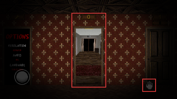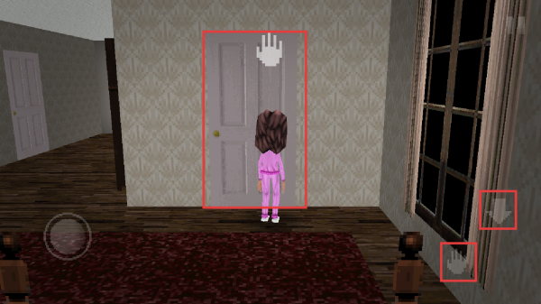 3、靠近门后,点击手掌按键可以开门,点击向下的方向键可以让角色蹲下。